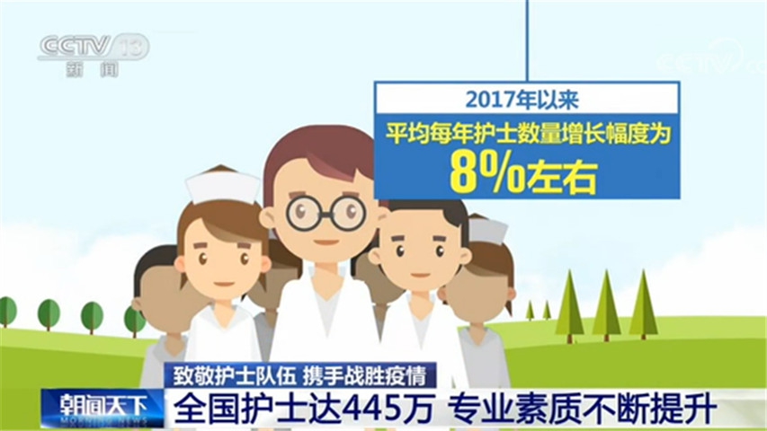 央视网消息:今天(12日)是国际护士节,主题是“致敬护士队伍,携手战胜疫情”。截至2019年底,全国注册护士总数约445万,比2018年增长35万。